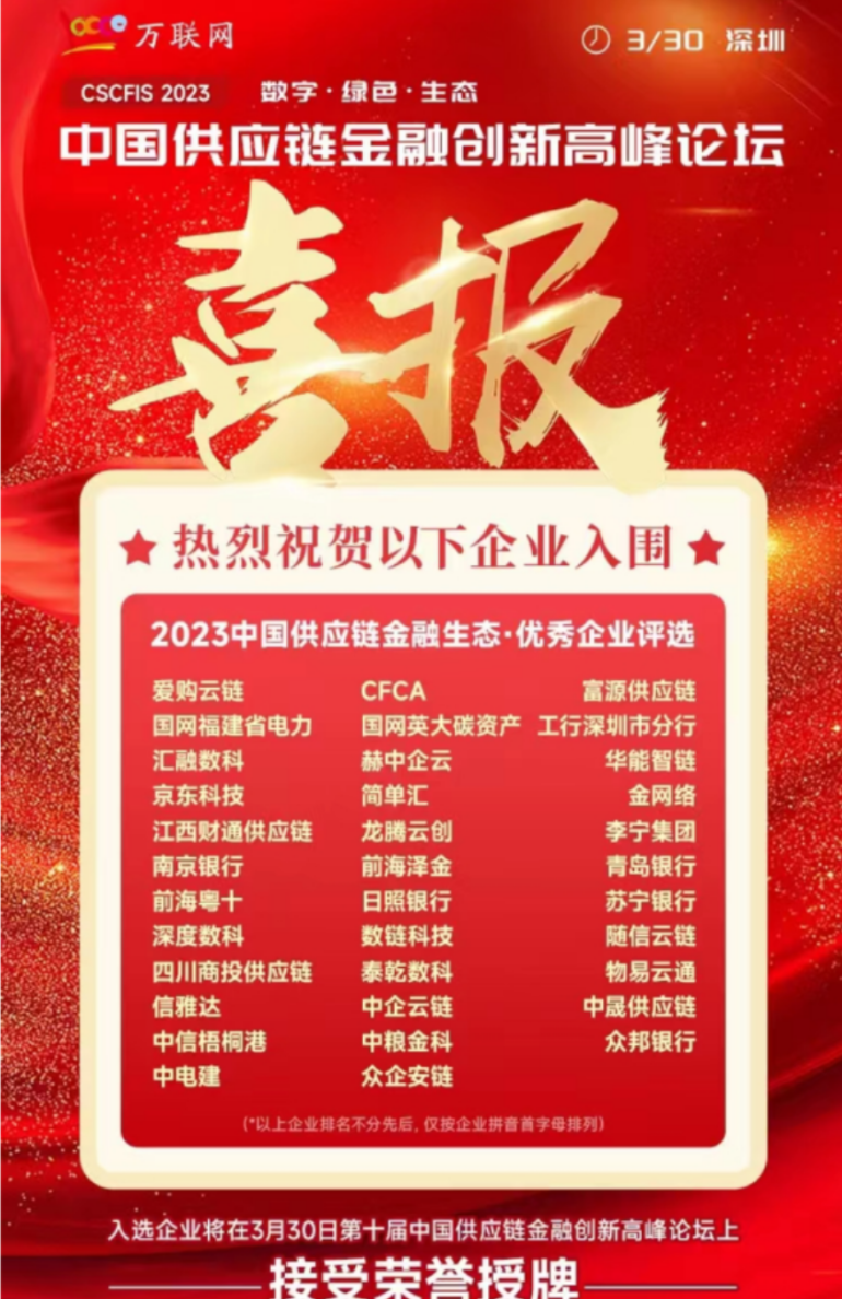 近日,由万联网、中国人民大学供应链战略管理研究中心联合主办的2023年第十届中国供应链金融创新高峰论坛在深圳顺利召开,中电建商业保理有限公司获得2023中国数字供应链金融生态-优秀企业“优秀保理公司”奖项。