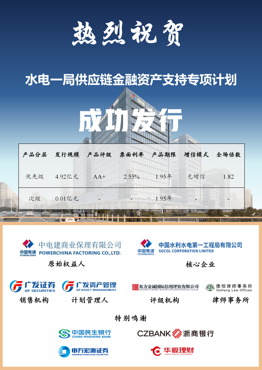 近日,公司作为原始权益人服务中国水利水电第一工程局有限公司(以下简称“水电一局”)成功发行专属供应链金融资产证券化产品。本产品发行规模4.93亿元,产品期限1.95年,纯信用模式发行,全场倍数1.82倍,创下同期供应链金融资产证券化产品发行价格最低。