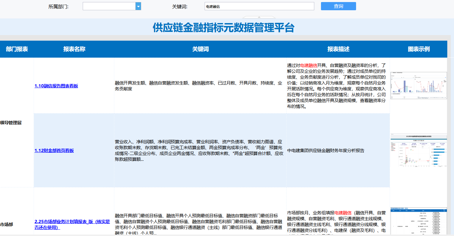 继发布中国电建供应链金融共享服务平台数据标准指标体系后,公司运营科技部正式发布全新的供应链金融指标元数据管理平台。这标志着我们在推动供应链金融行业数据标准化管理方面迈出了重要一步。