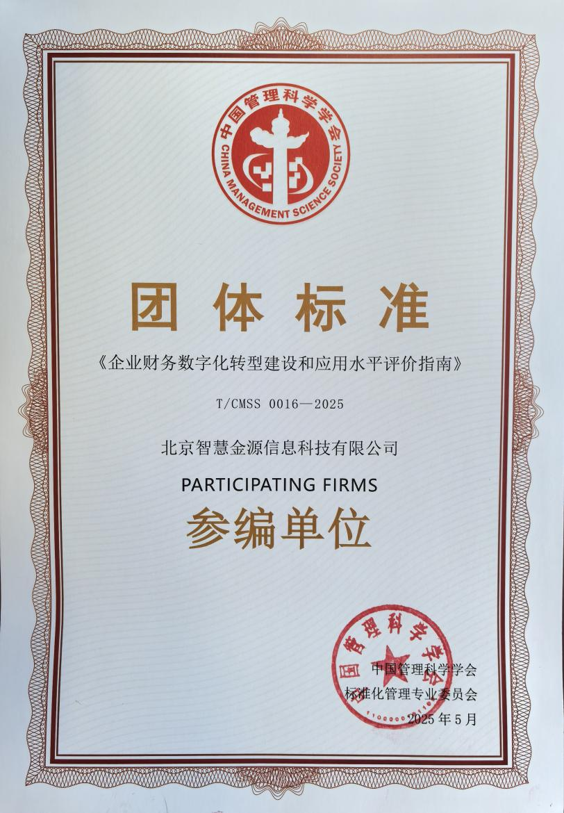 2025年5月中旬,由中国管理科学学会大数据管理专业委员会主办的“企业数字化转型与发展”专题会正式召开,电建保理公司下属子公司北京智慧金源信息科技有限公司(以下简称北京智慧金源公司)参编的《企业财务数字化转型建设和应用水平评价指南》团体标准(以下简称《指南》)在会上正式发布。