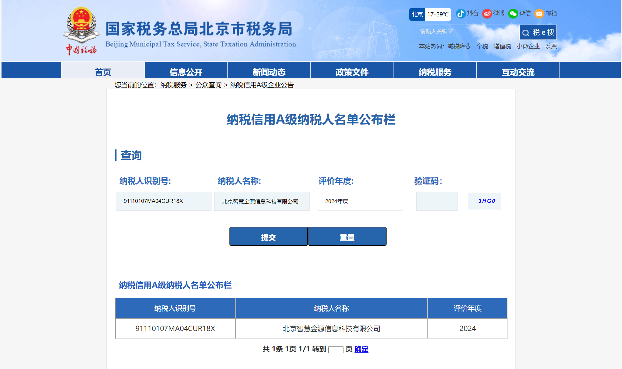 北京智慧金源公司严格遵守国家税收法律法规,不断完善内部财税管理体系,始终秉持“依法纳税、诚信经营”的理念,确保税款申报和缴纳的准确性、及时性。此次荣获A级认证,标志着北京智慧金源公司在税务合规性、财务透明度和社会责任履行方面达到了国家高标准,进一步提升了公司的市场公信力和品牌形象。公司将以A级纳税信用荣誉为新起点,持续坚持“合规经营,依法纳税”,同时积极发挥示范作用,为营造依法诚信纳税的市场环境贡献力量。