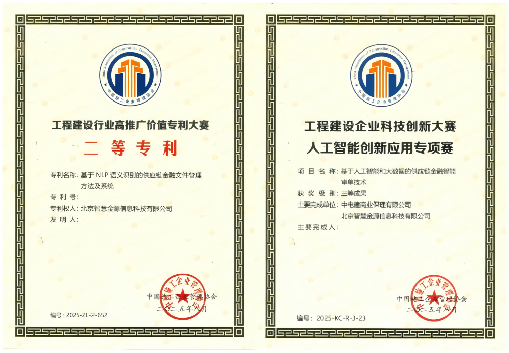 2025年9月,中电建商业保理有限公司(以下简称“电建保理公司”)及子公司北京智慧金源信息科技有限公司(以下简称“北京智慧金源”)在第七届工程建设行业科技创新大会上,凭借在金融科技领域的创新成果,荣获一项三等成果证书和一项二等专利证书,这不仅体现了公司在科技研发方面的持续投入与创新能力,也凸显了公司在驱动工程建设行业供应链数字化转型升级进程中取得的关键突破。